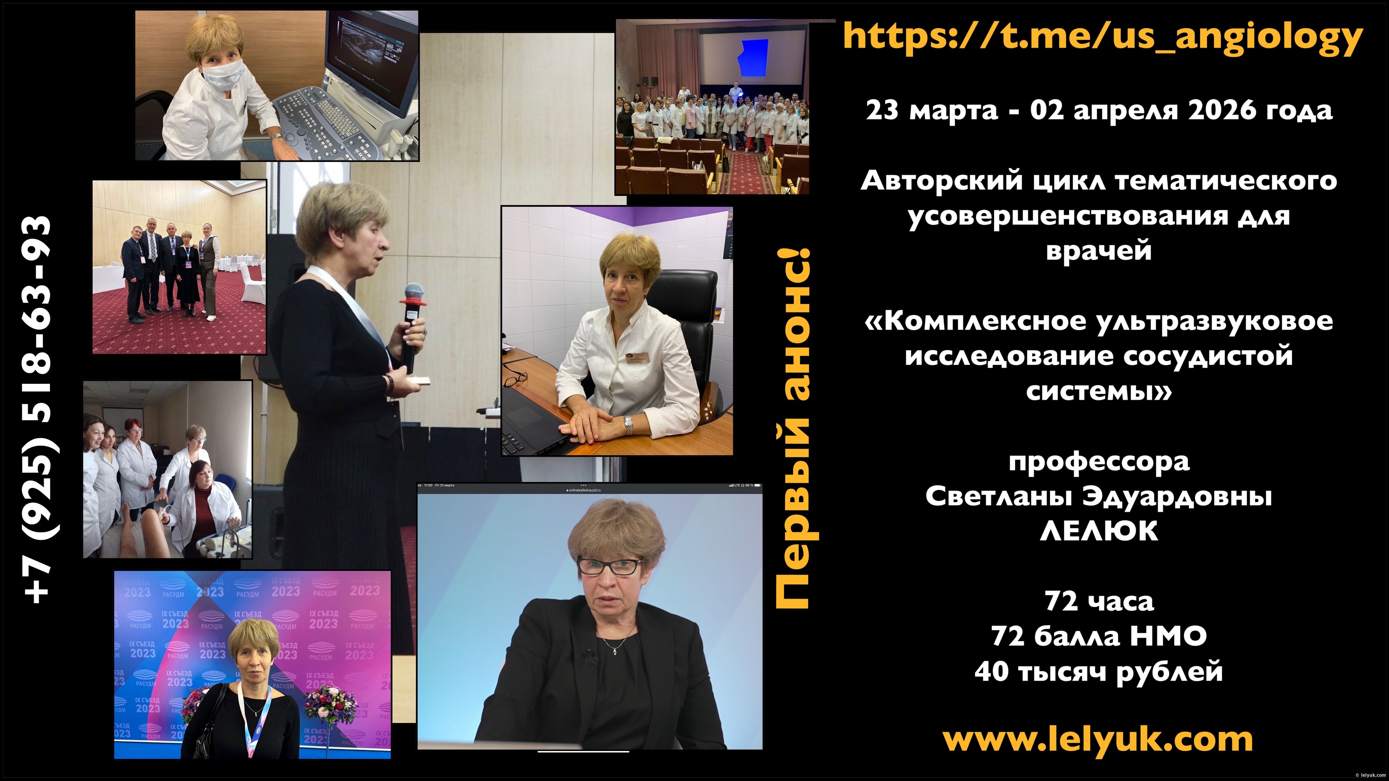 Цикл проводится более 28 лет (с 1997 года), на 81 проведенных к настоящему времени курсах обучились более 2200 (!) слушателей из всех регионов России, ближнего и дальнего зарубежья. Автор, куратор и преподаватель цикла - доктор медицинских наук, профессор, профессор кафедры ультразвуковой диагностики ФГБОУ ДПО РМАНПО МЗ РФ Светлана Эдуардовна Лелюк, преподаватели - доктор медицинских наук, профессор, заведующий кафедрой ультразвуковой диагностики ФГБОУ ДПО РМАНПО МЗ РФ Владимир Вячеславович Митьков и кандидат медицинских наук, доцент, доцент кафедры Мина Даутовна Митькова. Цикл очный. Проводится на клинической базе кафедры. В программе – лекции и мастер-классы (демонстрации ультразвуковых исследований пациентов с различными видами сосудистой патологии). По окончании обучения выдается удостоверение государственного образца. Подробное содержание программы, информация и регистрация на цикл – на сайте ФГБОУ ДПО РМАНПО МЗ РФ. Любую информацию, касающуюся проведения цикла, можно получить по телефонам +7 (495) 680-05-99, +7(925)518-63-93 или по почте edu@rmapo.ru, kafedrausd@yandex.ru. Стоимость обучения - 40 тысяч рублей. После прохождения цикла начисляется 72 балла НМО. Любую дополнительную информацию можно получить по телефону +7 (925) 518-63-93 или электронной почте kafedrausd@yandex.ru, в нашем телеграмм-канале Ультразвуковая ангиология – Ultrasound Angiology (https://www.t.me/us_angiology), в национальном мессенджере MAX (https://max.ru/join/Cl7bHom7WD59u3x7H_PqSjIbBRk3sBVirfy5SlTI2p8), сообществе VK (https://vk.ru/us_angiology), одноименных страницах и аккаунтах в других социальных сетях, а также сайте www.lelyuk.com.